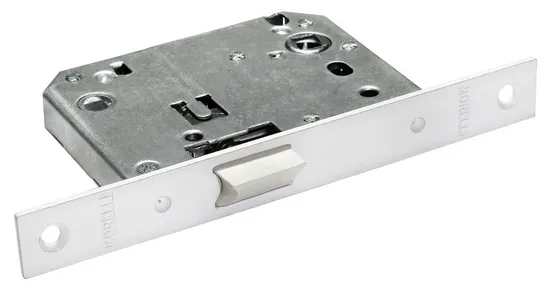 Сантехническая защелка с пластиковым язычком. Используется для бесшумного запирания дверей в сантехнические помещения. Межосевое расстояние 70мм.